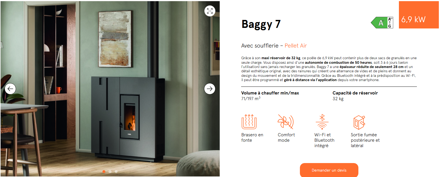 Grâce à son maxi réservoir de 32 kg, ce poêle de 6,9 kW peut contenir plus de deux sacs de granulés en une seule charge. Vous disposez ainsi d’une autonomie de combustion de 50 heures, soit 3 à 6 jours (selon l’utilisation) sans jamais recharger les granulés. Baggy 7 a une épaisseur réduite de seulement 28 cm et un détail esthétique original, avec des rainures qui créent une alternance de vides et de pleins et donnent au design du mouvement et de la tridimensionnalité. Grâce au Bluetooth intégré et à la prédisposition au Wi-Fi, il peut être programmé et géré à distance via l’application depuis votre smartphone.