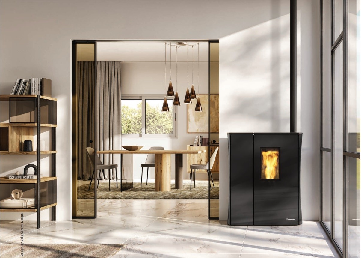 Le Cherie Slim 9+ est un poêle à granulés étanche, canalisable et compact, conçu pour s’intégrer facilement dans les espaces réduits grâce à sa faible profondeur.