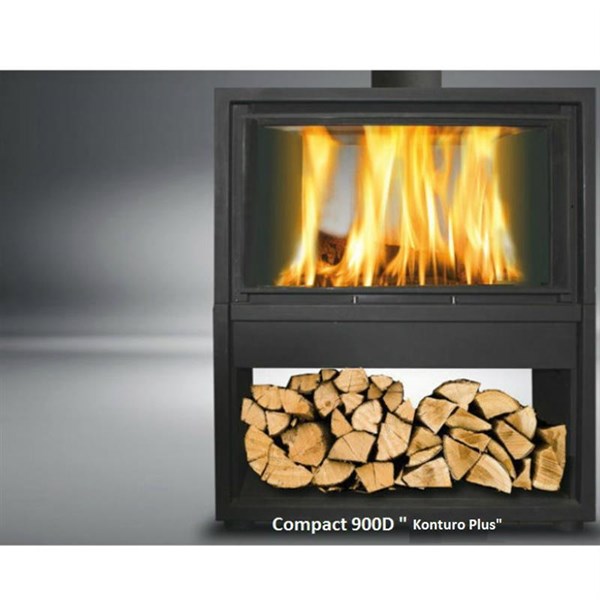 Habillage haut avec réserve de bois intégrée sous le foyer avec,en option, son kit prise d’air extérieur subtilement intégré dans la carrosserie et qui permet de placer le foyer au milieu de la pièce..