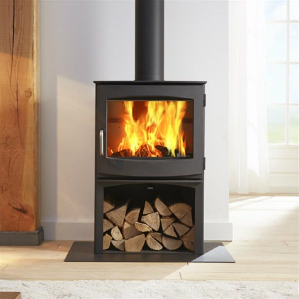 Le grand Ivar 8 StoreEA avec espace de rangement se place de manière autonome dans un séjour. Les poêles au bois Ivar contemporains et conviviaux sont en anthracite noir avec une porte épurée en fonte.