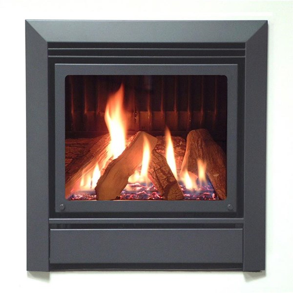 H 610/L 525/P 365 mm - Diam cheminée 107 mm - Vol chauffe : max 123 m3 - Chauffage principal. Foyer encastrable au gaz - Ventilateur - Système de combustion à tirage naturel - Flamme visible - Double brûleur - Décoration : charbons, galets, sarments - Option : Balcon.