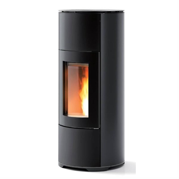 Poêle à pellets à ventilation forcée, réalisé en acier noir et panneau frontal coloré (Aluminium, Silver, Dark, Bordeaux).Tout nouveau foyer, plus profond et plus haut, qui suit le mouvement naturel de la flamme. Particulièrement adapté pour une installation d’angle.