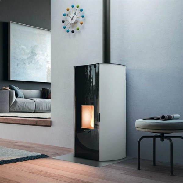 Poêle étanche de forme arrondie, avec porte en verre concave, avec sortie de fumées sur le dessus à travers un tube coaxial.