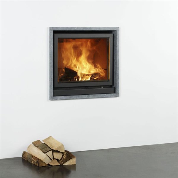 H 610 /L 580 /P 440 mm - Poids 92 kg - Diam cheminée 180 mm - Rendement 80%. Insert à bois sobre et épuré - Longueur de bûches V - / H 40 cm - Fonctionne exclusivement porte fermée - Système de nettoyage par balayage de la vitre - Double combustion - Admission pour l’arrivée d’air extérieur canalisable diam 63mm - Connexion au conduit sur le dessus - Option : 3 cadres (fin, appliqué 3 côtés et cornière de finition) - Table support – Kit Ventilateur.